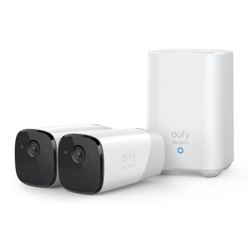 Draadloze camera met accu die zonder draden aangesloten kan worden. Zelfs als de WiFi uitvalt dan neemt de camera gewoon op. Met herkenning van huisdieren en mensen. Nestcam, set van 2.