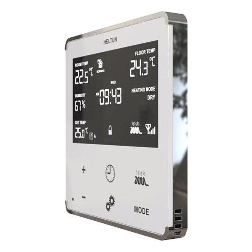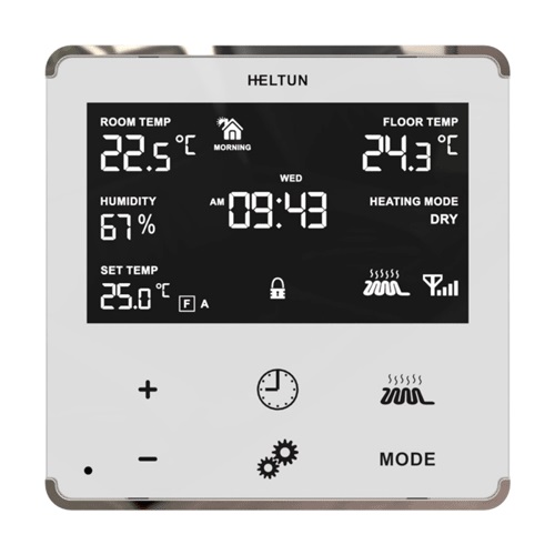 Slimme thermostaat in de diverse kleuren waarmee je de elektrische verwarming slim kunt maken. Koppel hem aan je Z-Wave-hub en geniet van slanke scènes die ervoor zorgen dat het warm is als jij er bent.
