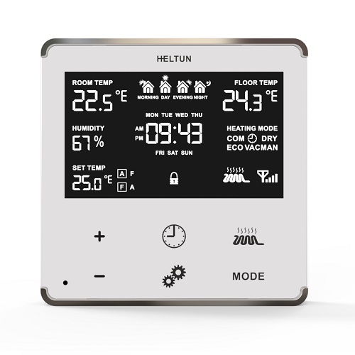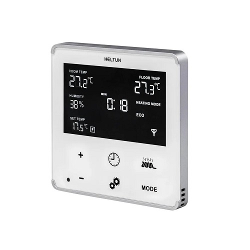 Slimme thermostaat in de diverse kleuren waarmee je de elektrische verwarming slim kunt maken. Koppel hem aan je Z-Wave-hub en geniet van slanke scènes die ervoor zorgen dat het warm is als jij er bent.